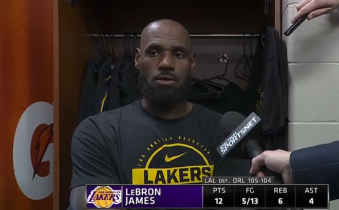北京時間3月22日,湖人客場105-104險勝魔術,肯納德完成三分準絕殺。詹姆斯上場34分鐘,13投5中得到12分6籃板4助攻3搶斷。賽后詹姆斯接受采訪。
