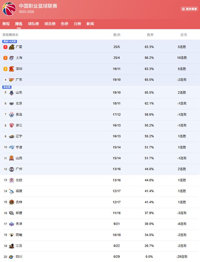 廣廈隊目前25勝5負,在多賽一輪的情況下,積分領先25勝4負的上海隊,來到了第1位,不過2隊第1名的爭奪非常激烈,上海雖然那豪取10連勝,打的非常強勢,但想甩開廣廈,卻也沒有那么容易!