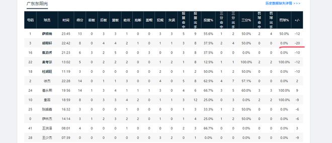 在第二階段已結束的六場比賽中,胡明軒有兩場正負值全隊最低,分別是對陣上海時的-20、主場對陣新疆時的-7。