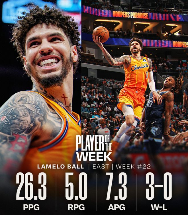 在黃蜂取得三戰(zhàn)全勝的一周后,鮑爾職業(yè)生涯首次斬獲周最佳球員獎項。該周期內(nèi),他場均砍下26.3分、5.0個籃板、7.3次助攻以及2.3次搶斷。鮑爾與隊友布蘭登-米勒上周場均命中4.7記三分,并列東部第一;在3月17日至3月23日的比賽中,鮑爾的場均得分、助攻和搶斷數(shù)據(jù)均位列東部前五。