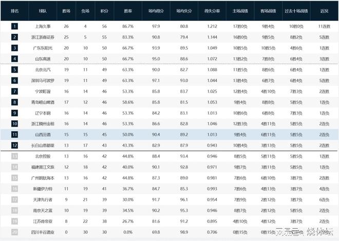 至此,上海男籃客場大獲全勝三殺對手,取得11連勝的同時迎來第26個勝場, 目前積56分領跑積分榜。山西男籃遭到2連敗,目前排名仍在季后賽區域,但前面建立的領先優勢被逐漸蠶食。