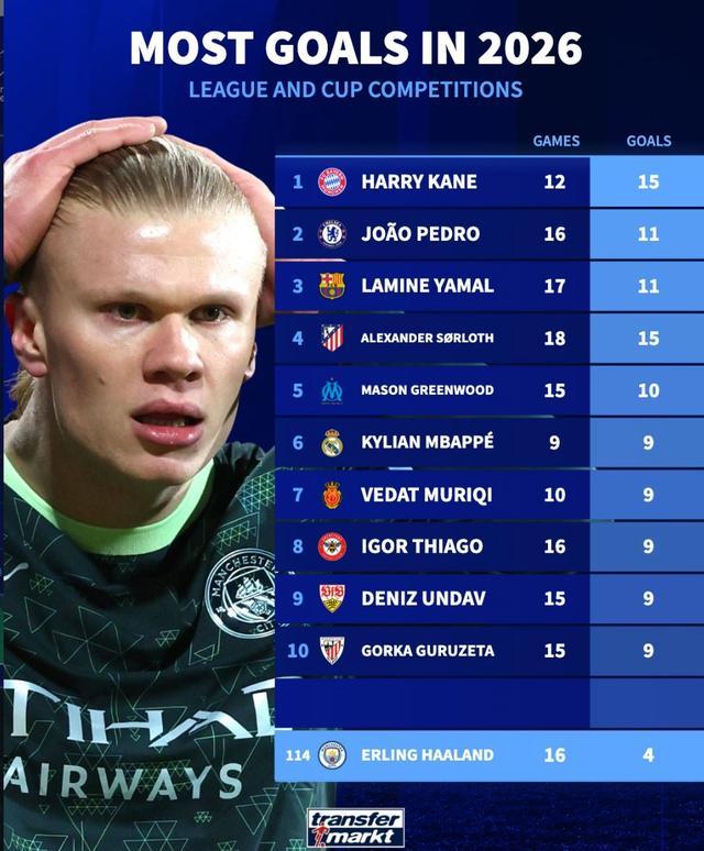 北京時間3月12日,曼城在歐冠1/8決賽首回合的比賽中客場0-3不敵皇馬,此戰(zhàn)哈蘭德首發(fā)出場但表現(xiàn)令人失望。賽后來自德轉(zhuǎn)的統(tǒng)計指出,哈蘭德2026年在各項賽事里代表曼城出場16次僅僅打進4球,同期哈里-凱恩以12場15球的數(shù)據(jù)高居全歐第一。