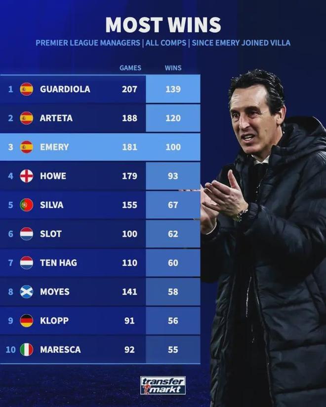 此役讓埃梅里執教維拉勝場定格100場,僅用181場刷新隊史最快紀錄!英超主帥勝場榜:瓜迪奧拉139勝、阿爾特塔120勝,這位曾被阿森納解雇的西班牙教頭竟躋身歷史前三。百勝對手名單赫然包括拜仁、巴黎等歐冠豪門。維拉官推曬出百勝海報時,球迷淚目:“他讓維拉重拾1982年歐冠冠軍之魂!”從保級隊到歐戰勁旅,埃梅里用傳控紀律重塑基因:本賽季客場3-0南安普頓等戰役,印證“細節控”哲學。