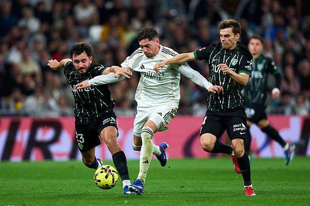 好在贏球的方案仍在皇馬手中。巴爾韋德的直接任意球射門被門將擋出,后衛慌亂中頭球解圍,被等待搶點的呂迪格抓個正著,迎球一腳打破僵局。這個有些偶然的進球瞬間改變局面。幾分鐘后,巴爾韋德持球推進發動進攻,弗蘭·加西亞巧妙將球短傳到禁區前,巴爾韋德假動作晃開空當,起腳直掛死角。烏拉圭人被阿隆索當成補丁球員,一場打右后衛另一場打后腰,整個上半賽季都沒開張。但在阿韋洛亞手下,他回到主角團隊,近1個月已經打進6球。