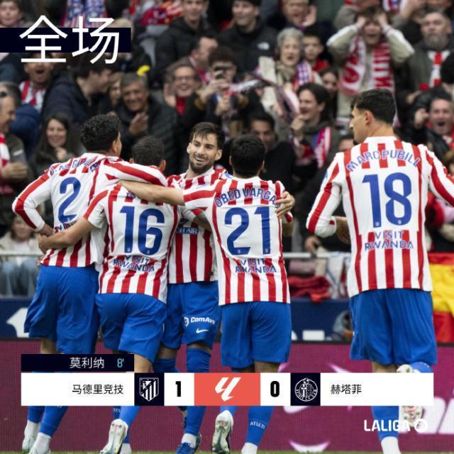 在馬德里的另一場比賽,馬競也貢獻了一記世界波,憑借莫利納開場8分鐘的禁區外爆射死角,馬競主場1比0小勝赫塔費,相同場次的情況下領先黃潛2分位居第3。