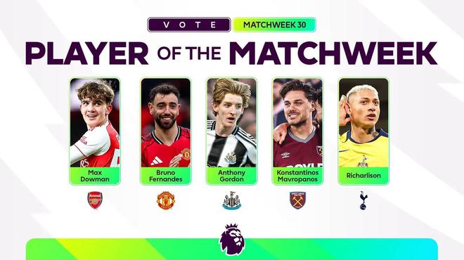 - 英超第30輪最佳球員候選:道曼、B費、里沙利松等人在列