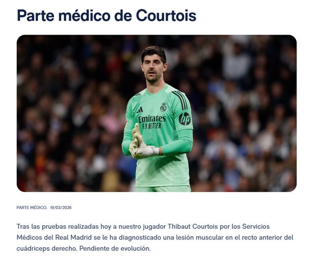 《阿斯報》指出,原本以為,庫爾圖瓦只是肌肉負荷問題,缺席周日的西甲馬德里德比。不過,庫爾圖瓦的傷情比想象中嚴重,他需要6周時間養傷。從賽程來看,庫爾圖瓦至少缺席皇馬未來8場比賽:
