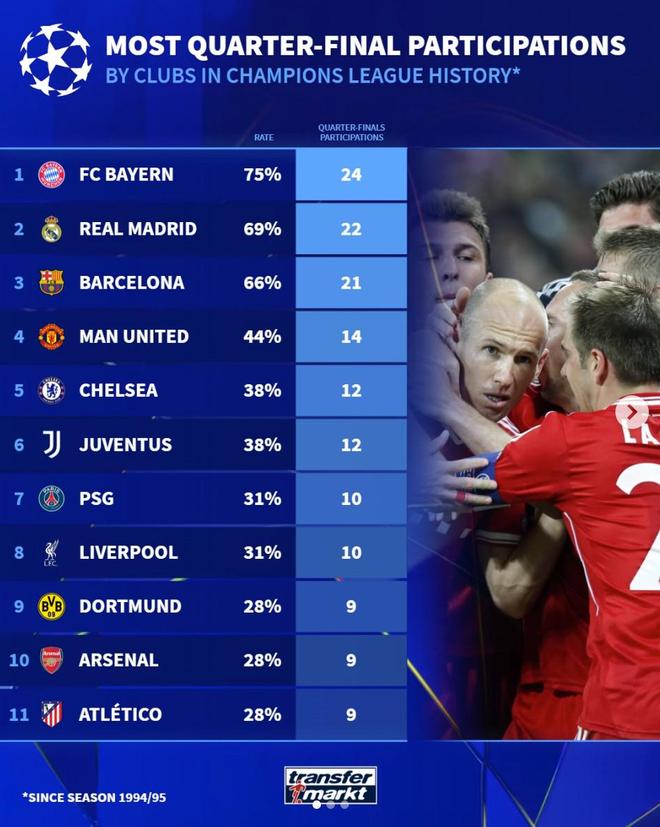 北京時間3月20日,在本賽季歐冠8強全部出爐之后,德轉統計出了1994-95賽季至晉級歐冠8強次數最多的11家俱樂部,拜仁慕尼黑以24次高居第一,皇家馬德里22次第二,巴塞羅那21次第三。