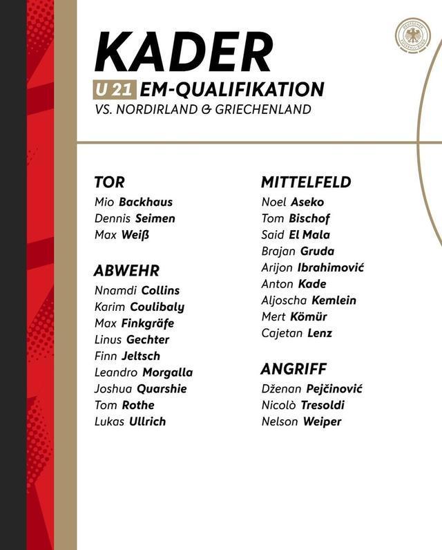 北京時間3月20日,德國U21國青隊公布了新一期大名單,比朔夫、賽義德-馬拉、阿塞科、格魯達以及阿爾揚-伊布拉希莫維奇入選。