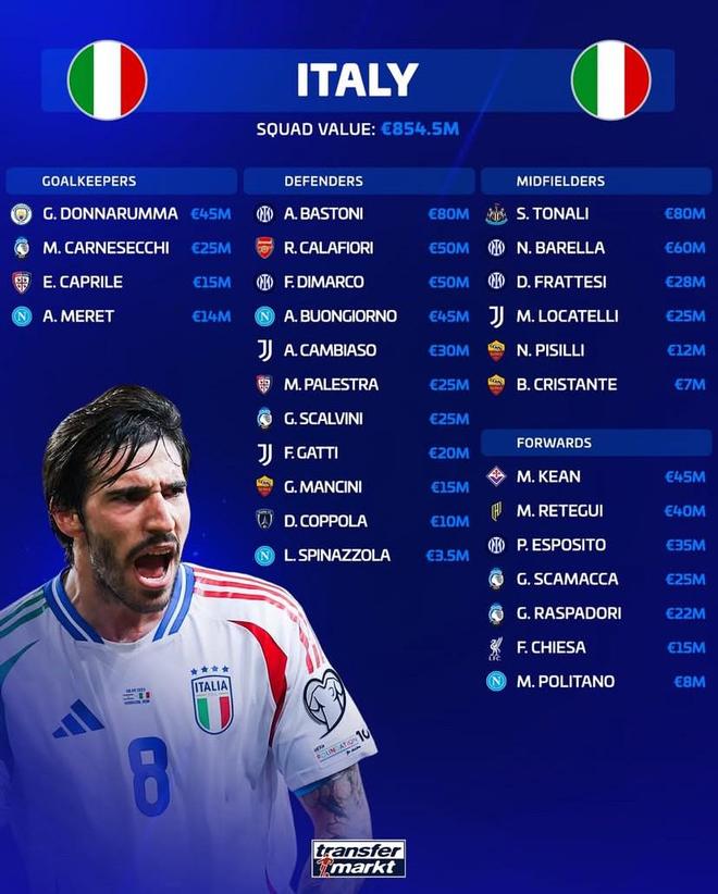 意大利國家隊新一期大名單德轉身價榜: