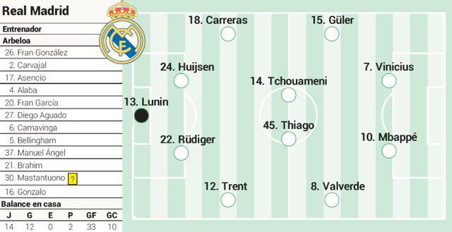 皇馬預計首發十一人: 盧寧 / 特倫特、呂迪格、懷森、卡雷拉斯 / 巴爾韋德、蒂亞戈、楚阿梅尼、居萊爾 / 姆巴佩、維尼修斯