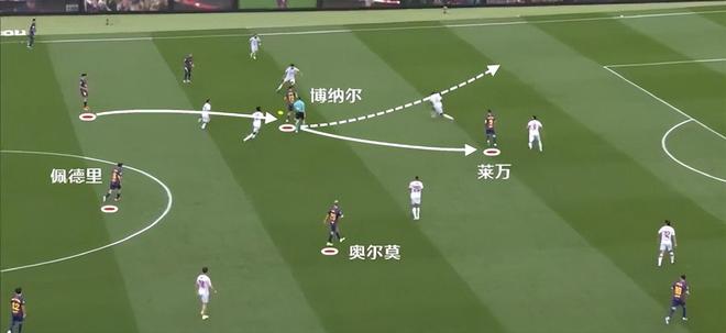 雖然之后皮球沒有給到貝爾納爾這一側,不過通過佩德里的傳球找到了中路奧爾莫的機會。