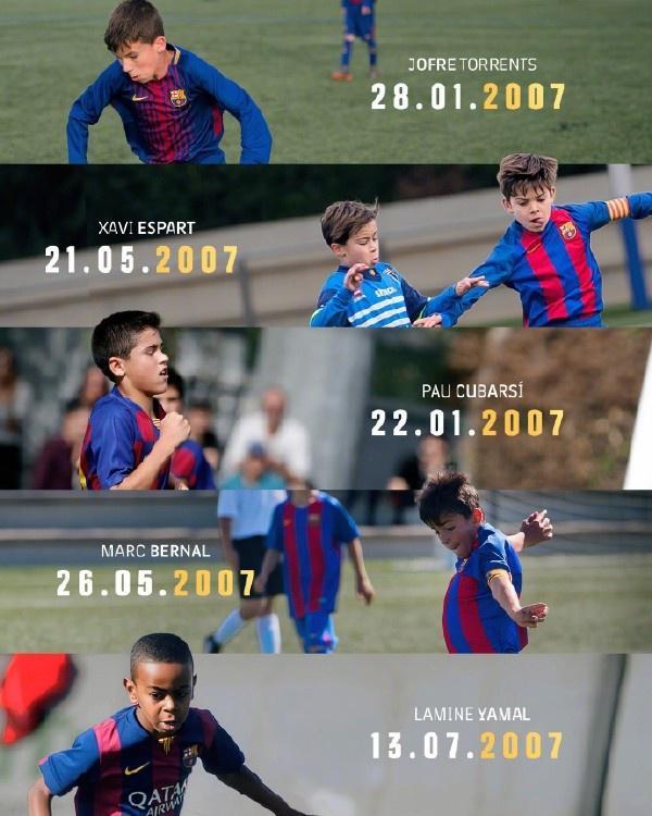 在見證了87一代的輝煌后,拉瑪西亞又涌現出一批新的天才。恰好比87一代小了20歲,同樣都生于2007年的亞馬爾、庫巴西和貝爾納爾組成了全新的三人組。跟他們一樣,出生于2007年的還有埃斯帕特和托倫茨。