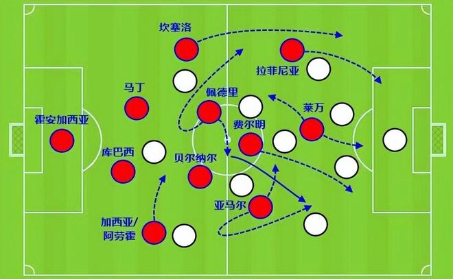 尤其是亞馬爾持球從邊路內切時,當佩德里向外線走,對方注意力自然會被帶走,于是前頂到禁區前的貝爾納爾就有了用武之地。