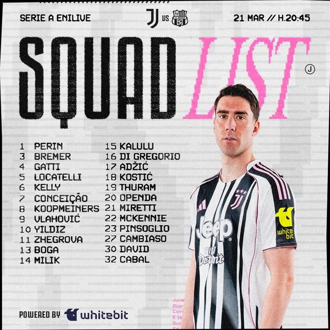 北京時間3月22日凌晨3點45分,意甲第30輪,尤文將在主場迎戰薩索洛。賽前,尤文圖斯官方公布了本場比賽的大名單。