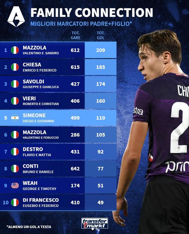 - 意甲歷史父子進球榜:基耶薩父子第2,西蒙尼父子第5