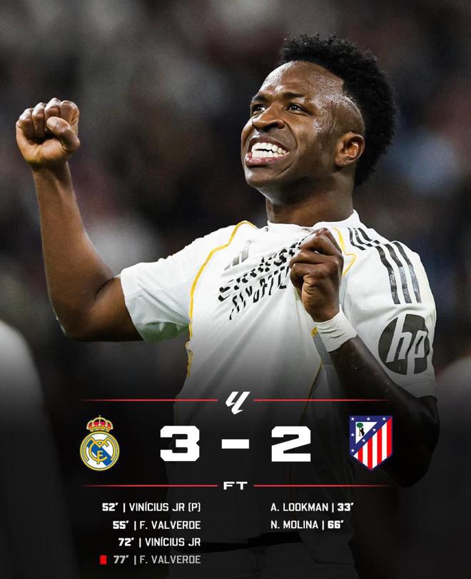 第77分鐘,巴爾韋德戰(zhàn)術(shù)犯規(guī)被直接紅牌罰下,馬競看到了翻盤的希望,隨后大舉壓上瘋狂進(jìn)攻。最后十多分鐘,皇馬10人死守,盧寧、呂迪格與姆巴佩的連續(xù)解圍才把3-2的比分守到終場。復(fù)仇成功的皇馬拿下各項(xiàng)賽事五連勝,繼續(xù)對巴薩施加壓力。