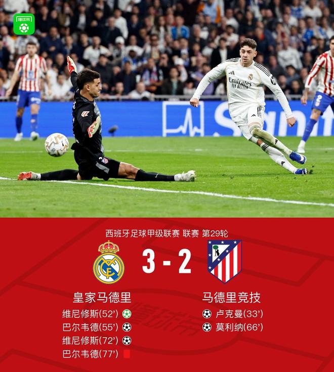 北京時間3月23日西班牙足球甲級聯賽 聯賽 第29輪,皇家馬德里主場對陣馬德里競技。皇家馬德里維尼修斯梅開二度,巴爾韋德破門。馬德里競技盧克曼破門,莫利納破門。最終比分皇馬 3-2 馬競。