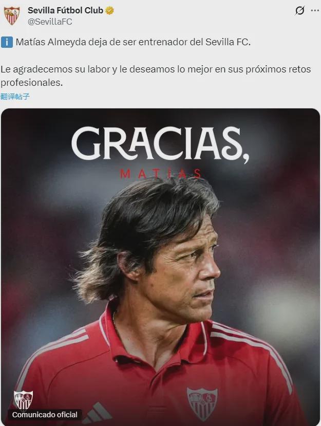 官方:塞維利亞宣布解雇了主帥馬蒂亞斯-阿爾梅達,他們最近剛剛在主場0-2輸給了瓦倫西亞。