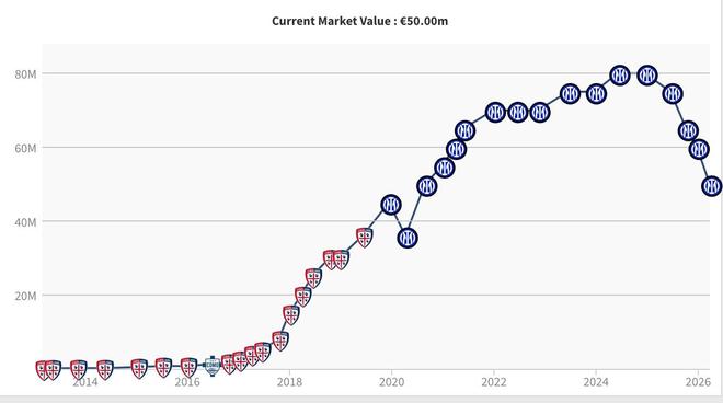 根據統計,此次身價下跌讓巴雷拉遭遇了德轉身價的四連跌,他的身價也從2024年巔峰時期的8000萬歐元一路下跌至如今的5000萬歐元。