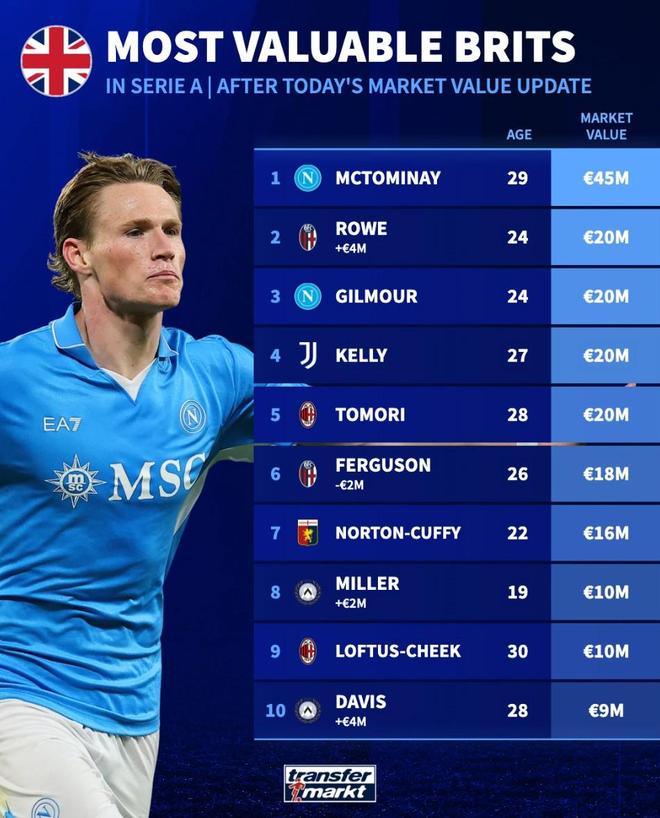 北京時間3月24日,在更新了意甲球員的身價之后,德轉(zhuǎn)統(tǒng)計出了此次更新后意甲身價排名前10的英國球員,麥克托米奈以4500萬歐元排名第1,勞埃德-凱利、托莫里、洛夫圖斯-奇克上榜。