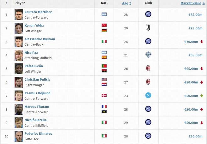 - 意甲身價更新:勞塔羅8500萬歐仍居首,巴斯托尼下降1000萬歐
