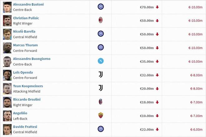 本期意甲身價跌幅榜前十