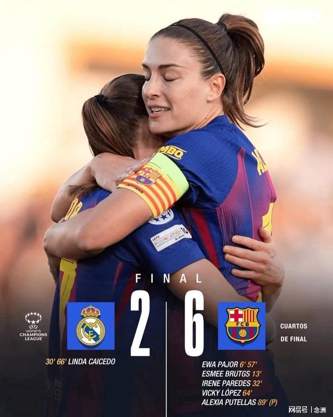 女足歐冠8強首回合,皇馬主場2-6不敵巴薩,巴薩方面,帕喬兩球,布魯格茨、帕雷德斯、維姬·洛佩斯破門,普特拉斯點射。皇馬方面,琳達-凱塞多雙響,但難挽敗局。