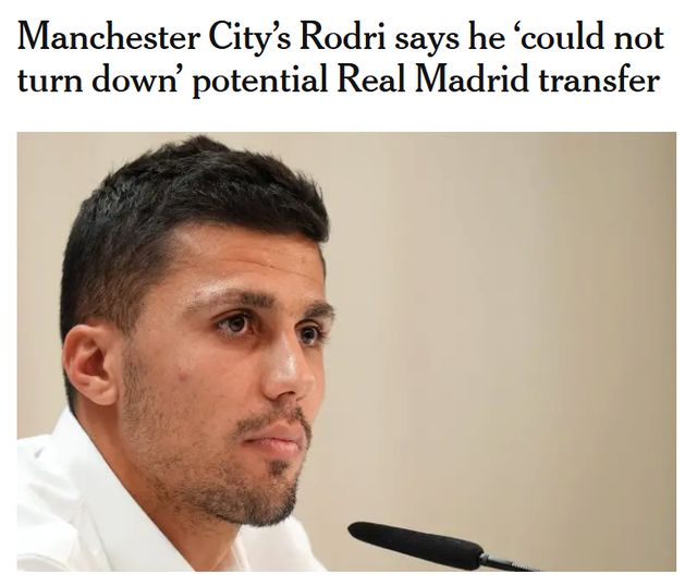 29歲的羅德里,與曼城的合同2027年夏天到期。3月26日,深度媒體TA等消息源報道,羅德里有意重返西甲踢球。如果能為皇馬效力,這是“無法拒絕的機會”。這是羅德里兩年來,第2次公開向皇馬示好。